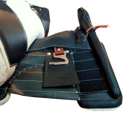 5.- Se puede elegir entre cincha vaquera tradicional o latiguillos de doma, con un primer latiguillo elástico que facilita los movimientos y no disminuye la capacidad torácica del caballo. Liberando la presión de las espaldas. Segundo latiguillo en “V-System”, fija toda la silla al caballo, evitando el balanceo sin causarle presión en las espaldas. La antigua cincha vaquera sujetaba la silla por un único punto adelante y de forma inestable, ya que bailaba de atrás hacia adelante dentro de la silla. Con la aplicación de la cincha de doma, la silla se sujeta por 3 puntos (delante, medio, atrás) consiguiendo una sujeción fija y completa.